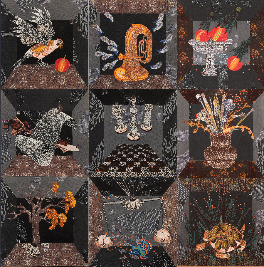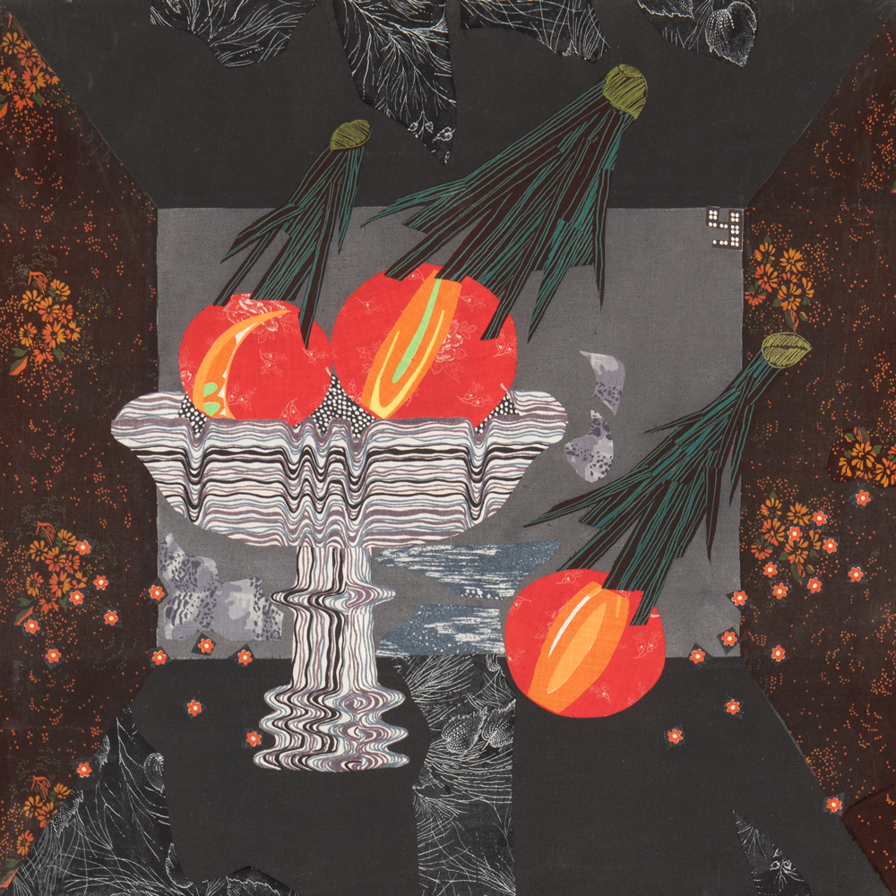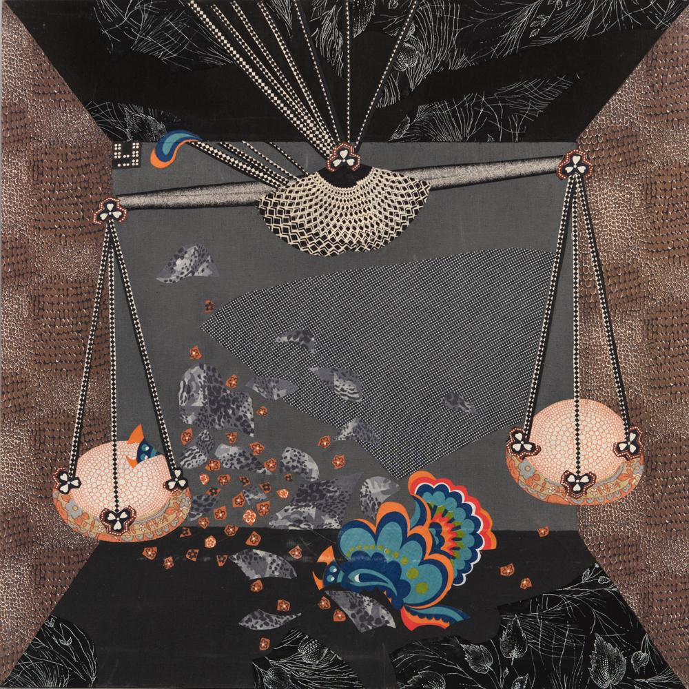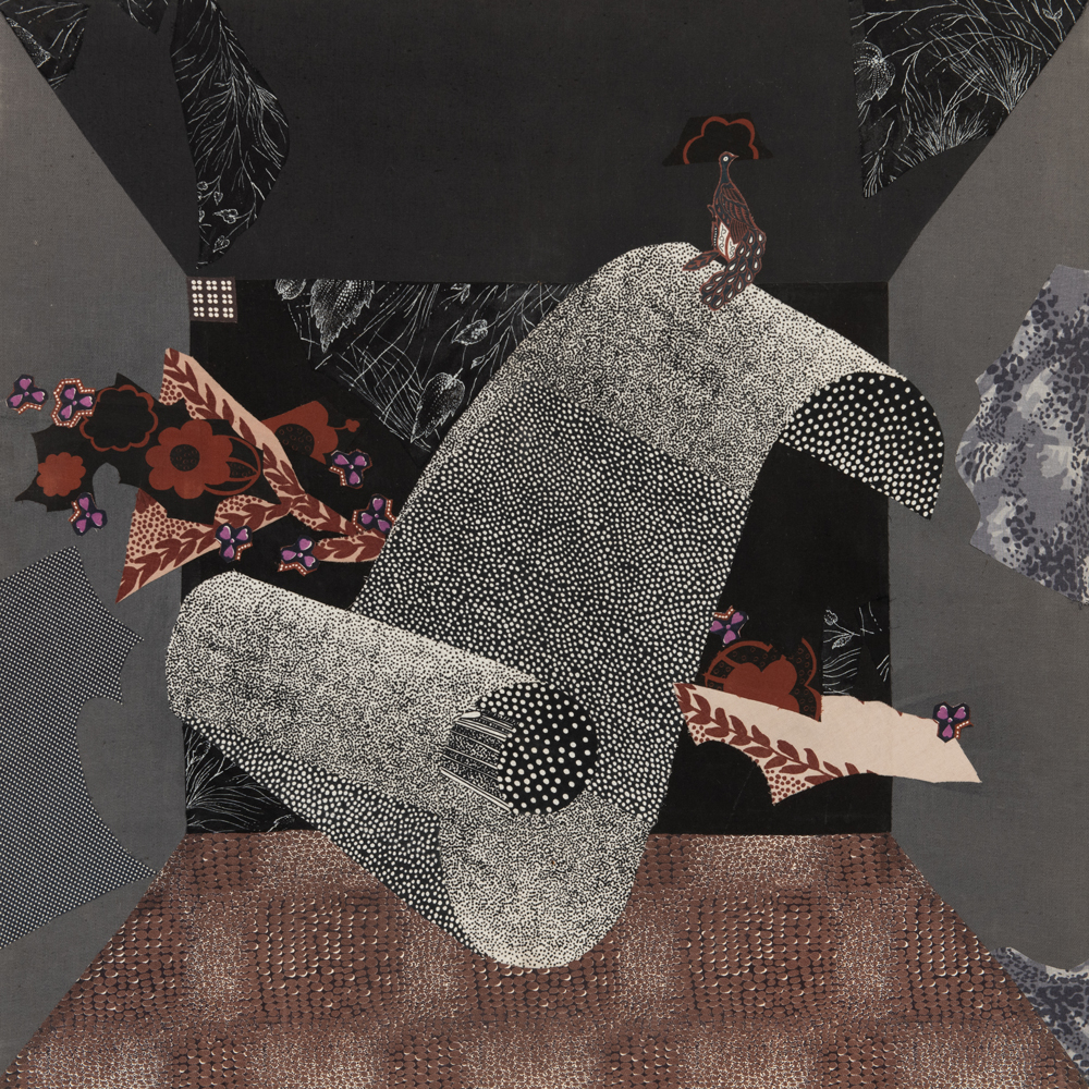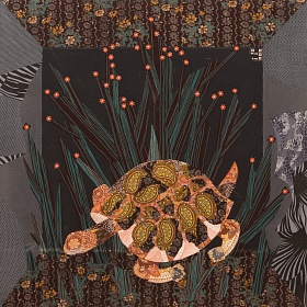 Если смотреть издали, может казаться, что это модернистская живопись, изображающая некий шкаф, где каждая полка «трехмерна», а вставленный в нее образ — нет. Подходя ближе, мы понимаем, что эти изогнутые свитки, летящие перья, блеск трубы, водоросли в аквариуме, черепаха и попугай – это все гениально подобранные кусочки самых обычных тканей.