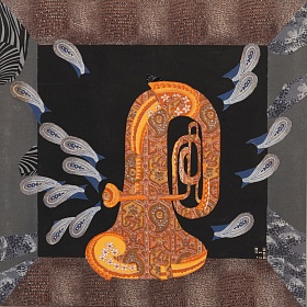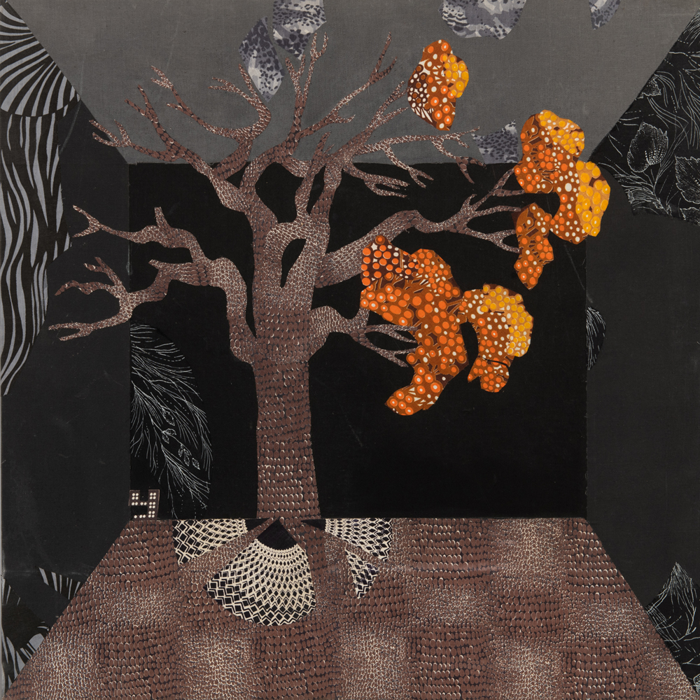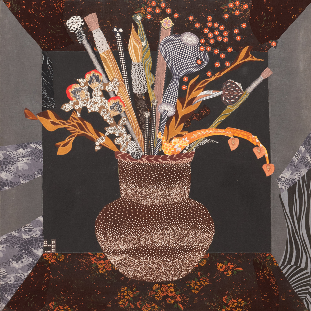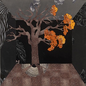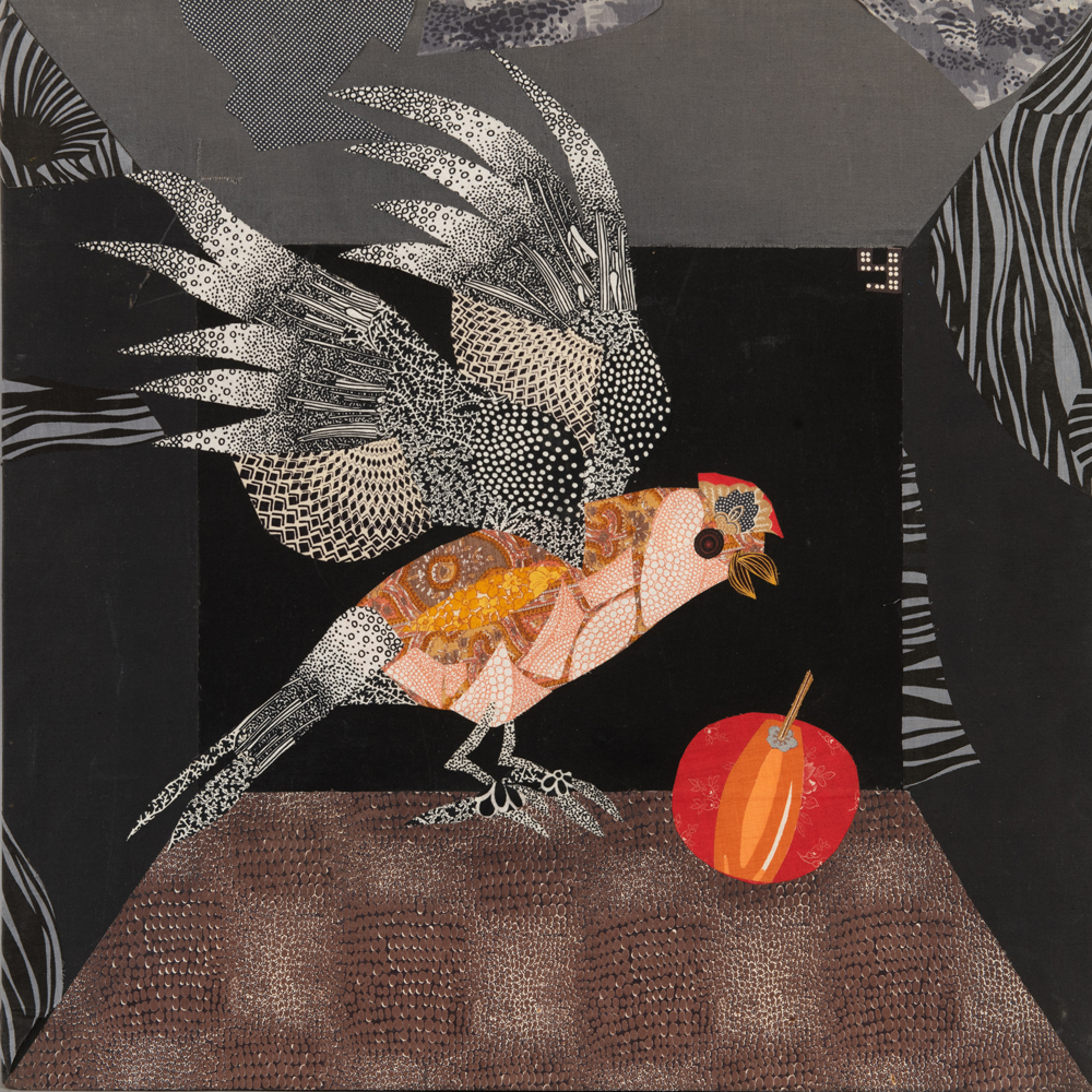 Если смотреть издали, может казаться, что это модернистская живопись, изображающая некий шкаф, где каждая полка «трехмерна», а вставленный в нее образ — нет. Подходя ближе, мы понимаем, что эти изогнутые свитки, летящие перья, блеск трубы, водоросли в аквариуме, черепаха и попугай – это все гениально подобранные кусочки самых обычных тканей.