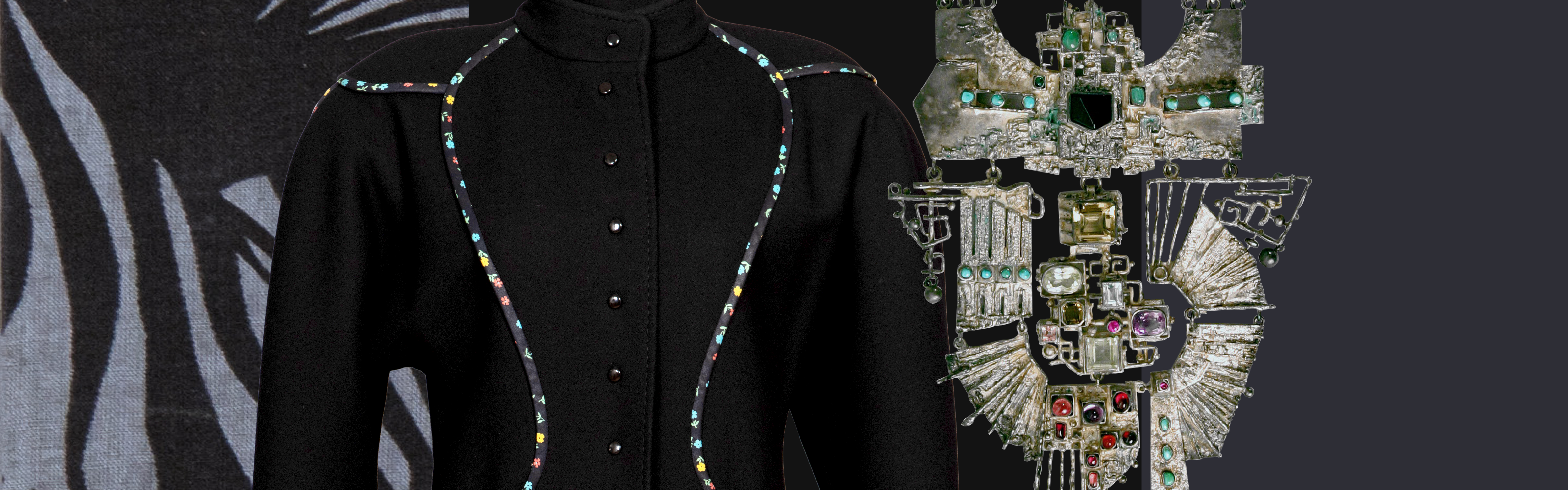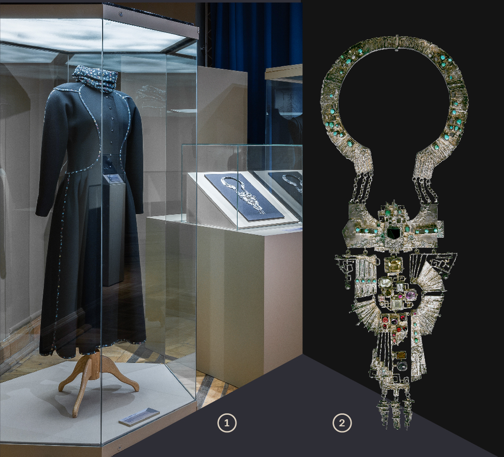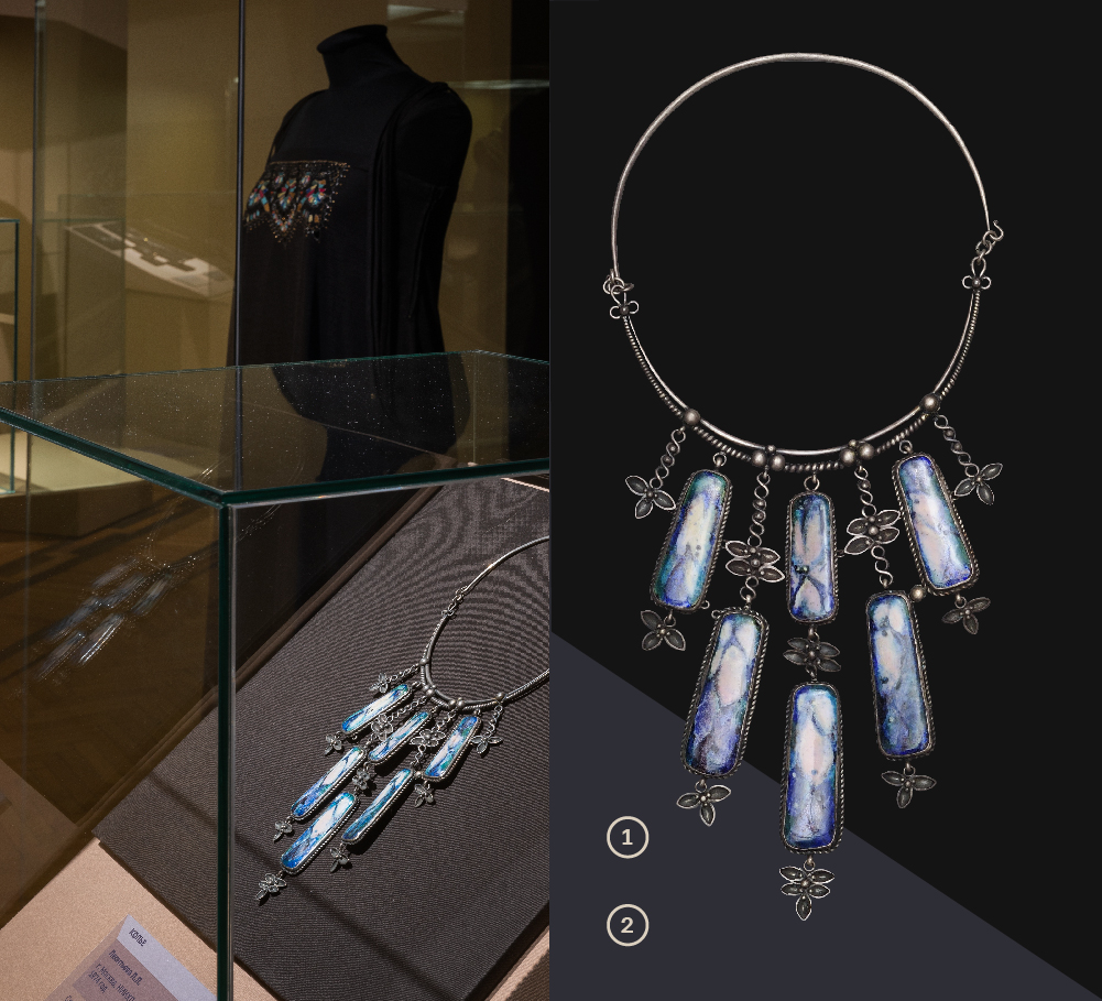 1. Пальто. Из комплекта одежды «Кант». г. Москва. Специальное художественно-конструкторское бюро Минлегпрома РСФСР (СХКБ), 1986 год. Автор: Осмеркина Т.А. художник-модельер. Шерсть, ситец. Всероссийский музей декоративного искусства. 2. Ожерелье «Легенда», г. Москва. 1970-е гг. Автор: Зотов В.А. Бирюза, цитрин, рубин, рубин синтетический, турмалин, сердолик, агат, аквамарин, аметист, берилл, халцедон, изумруд, гранат, серебро, огранка, монтировка. Всероссийский музей декоративного искусства.
