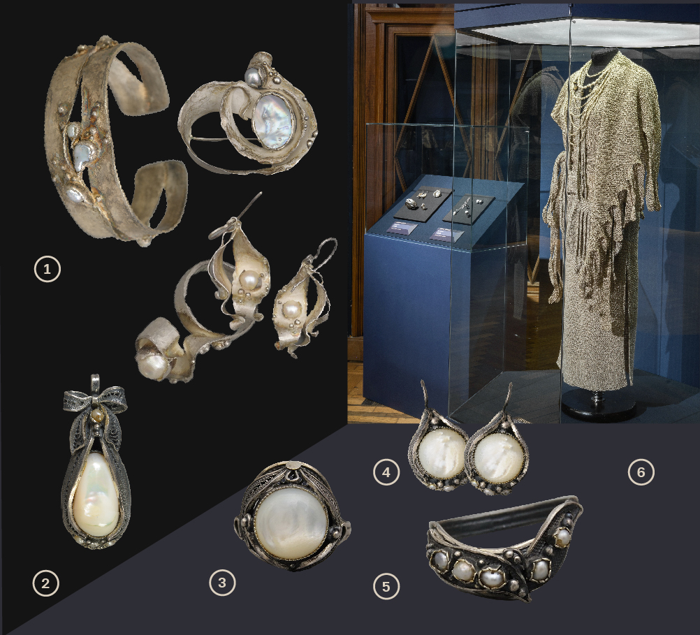 1. Парюр (браслет, брошь, кольцо, пара серег) г. Москва. 1970-е гг. Автор: Белякова Н.Е. Жемчуг, перламутр, серебро, монтировка, дифовка, зернь. Всероссийский музей декоративного искусства 2. Кулон на цепочке Из парюра «Белые ночи» г. Москва, 1970-е гг. Автор: Буданов С.М. Перламутр, серебро, жемчуг, зернь, плетение, оксидирование, скань. Всероссийский музей декоративного искусства 3. Кольцо Из парюра «Белые ночи» г. Москва 1970-е гг. Автор: Буданов С.М. Исполнитель: Борисова Перламутр, серебро, скань, оксидирование, зернь. Всероссийский музей декоративного искусства 4 Серьги Из парюра «Белые ночи», г. Москва,1970-е гг., Автор: Буданов С.М., Исполнитель: Борисова Перламутр, жемчуг, серебро, скань, оксидирование, зернь. Всероссийский музей декоративного искусства 5. Кольцо Из парюра «Белые ночи» г. Москва 1970-е гг. Автор: Буданов С.М. Жемчуг, серебро, скань, оксидирование, зернь. Всероссийский музей декоративного искусства 6. Комплект одежды «Охота на лис» г. Москва, 1986 г., Автор: Санчес Т.И. Лен, вязание на спицах. Всероссийский музей декоративного искусства