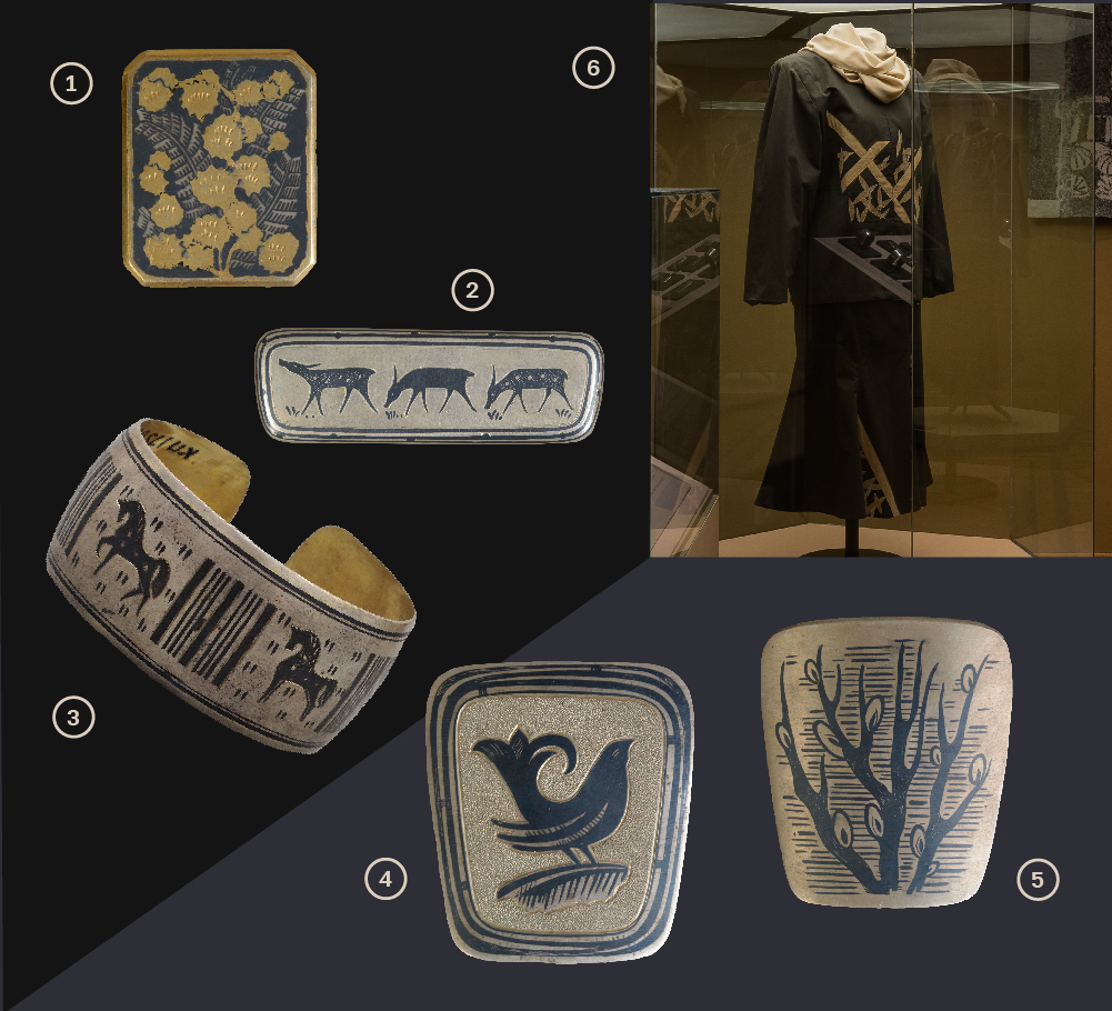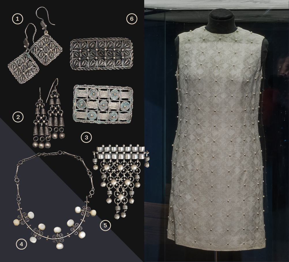 1. Комплект ювелирных украшений (дамский гарнитур) Костромская область, с. Красное. Красносельская ювелирная фабрика1960 г. Автор и исполнитель: Сафарова Р.А. Медь, скань. Всероссийский музей декоративного искусства 2. Серьги из комплекта г. Москва. Научно-исследовательский институт художественной промышленности (НИИХП) 1969 г. Автор: Тоне М.А. Серебро, скань, зернь. Всероссийский музей декоративного искусства 3. Брошь Костромская область, с. Красное. Красносельская ювелирная фабрика1960 г. Автор и исполнитель: Сафарова Р.А. Медь, скань, зернь, серебрение. Всероссийский музей декоративного искусства 4. Колье из комплекта с серьгами г. Москва. Научно-исследовательский институт художественной промышленности (НИИХП) 1967 г. Автор: Зенкова З.М. Серебро, перламутр, скань, шлифовка Всероссийский музей декоративного искусства 5. Брошь из комплекта г. Москва. Научно-исследовательский институт художественной промышленности (НИИХП) 1969 г. Автор: Тоне М.А. Серебро, скань, зернь. Всероссийский музей декоративного искусства 6. Платье из льняной узорной ткани г. Москва1960-е годы Автор: Левашова А.А. Лен, бусины, застежка - «молния». Всероссийский музей декоративного искусства