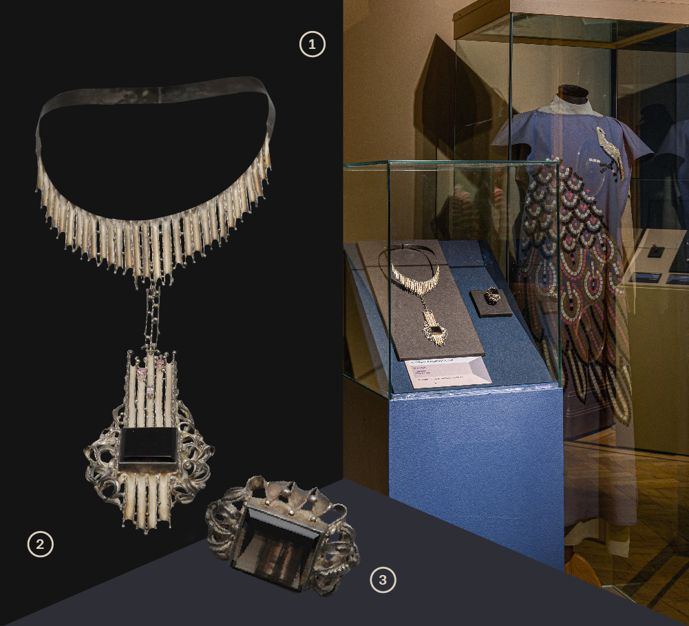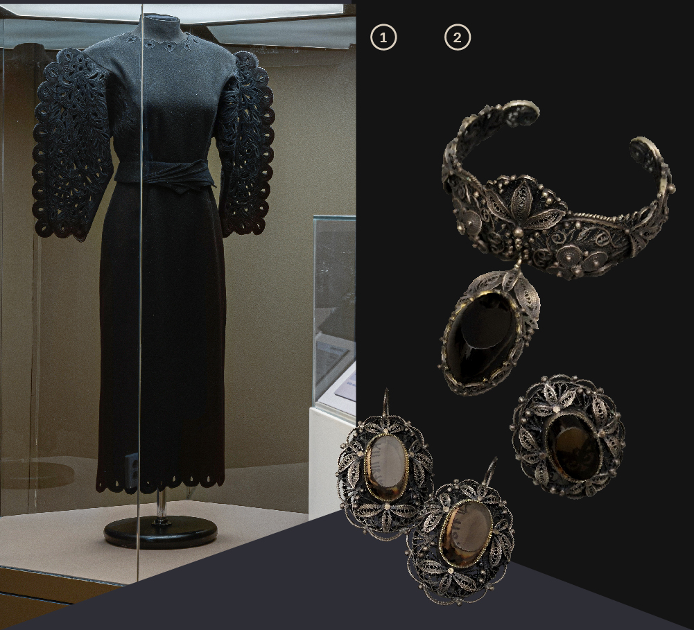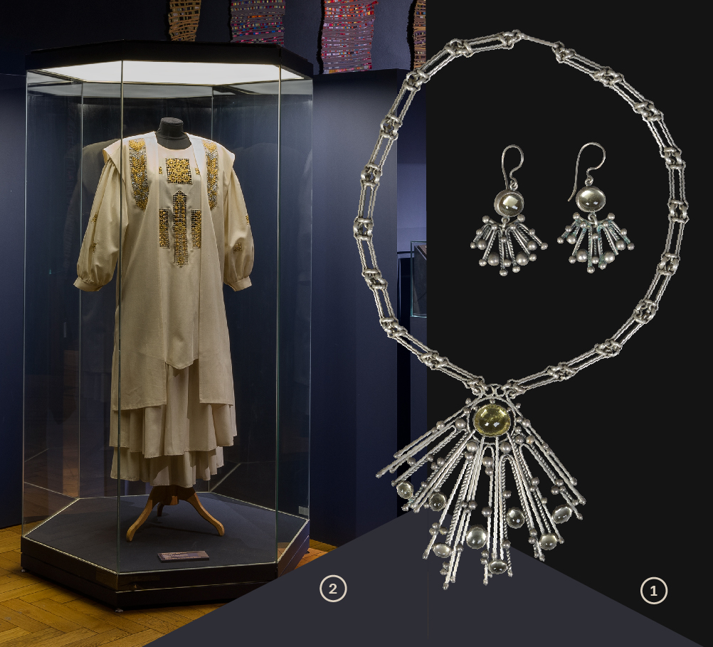 1. Женское платье с поясом. г. Москва. Общесоюзный дом моделей одежды (ОДМО). 1986 год. Автор: Осмеркина Т.А. художник-модельер. Шерсть, вышивка. Всероссийский музей декоративного искусства 2. Парюр (браслет, кольцо, пара серег), г. Москва, 1970-е гг., Автор: Ю.П. Савельев, Кварц дымчатый, серебро, зернь, скань. Всероссийский музей декоративного искусства