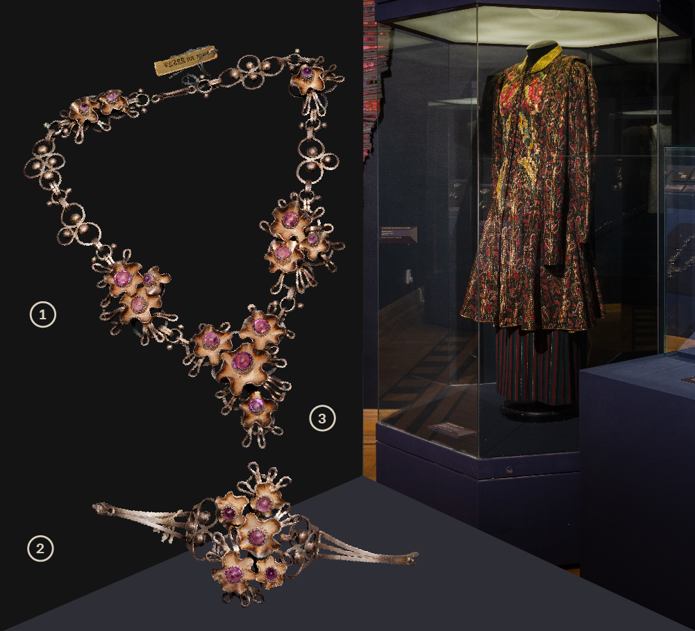 1-2. Гарнитур женских украшений г. Москва. Научно-исследовательский институт художественной промышленности (НИИХП), 1977 г., Автор: Зенкова З.М., Серебро, аметист, зернь Колье, браслет. Всероссийский музей декоративного искусства3. Жакет. Из комплекта женской одежды, г. Москва. Общесоюзный дом моделей одежды (ОДМО), 1985 г., Автор: Иванова Е.М., Шерсть, люрекс, пуговицы, вышивка. Всероссийский музей декоративного искусства