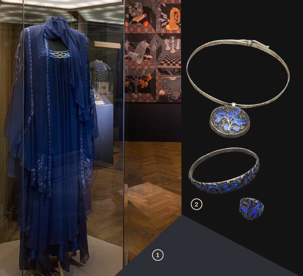 1. Из комплекта вечерней женской одежды, г. Москва. Московский Дом моды Вячеслава Зайцева, 1989 год, Автор: Зайцев В.М. художник-модельер, шифон, люрекс, блестки, вышивка. Всероссийский музей декоративного искусства. 2 Браслет. Из комплекта парюра женских украшений, 1970-е гг. Автор: Бешенцева И.Б., металл, серебро, эмаль по скани, оксидирование, гравировка Гривна со съемным запором, из комплекта парюра женских украшений, г. Москва, 1970-е гг. Автор: Бешенцева И.Б., металл, серебро, эмаль по скани, оксидирование, гравировка Кольцо, из комплекта парюра женских украшений, 1970-е гг. Автор: Бешенцева И.Б. Металл, серебро, эмаль по скани, оксидирование, гравировка. Всероссийский музей декоративного искусства.