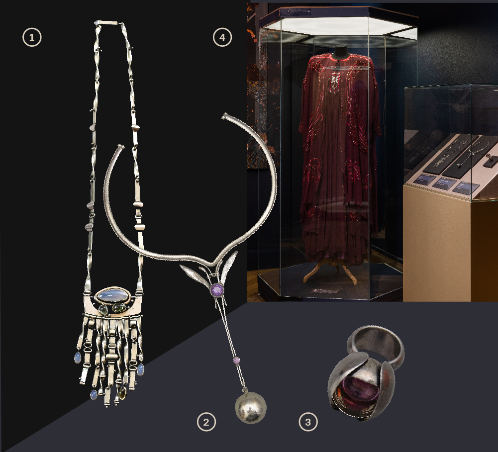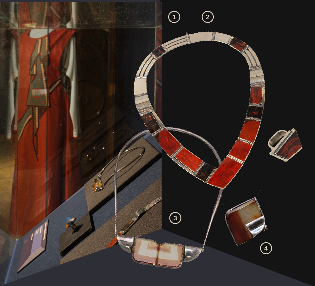 1. Платье. Из комплекта одежды «Перевязь» из серии «Древняя Русь» г. Москва. Московская организация Союза художников РСФСР (МОСХ), 1989-1990 гг. Хлопок, нити шелковые, аппликация, вышивка машинная Автор: Л.И. Куликова художник-модельер. Всероссийский музей декоративного искусства 2. Комплект ювелирных украшений, г. Москва, 1988 г., Автор: М.А. Тоне. Яшма, мельхиор, монтировка Колье, Кольцо. Всероссийский музей декоративного искусства 3-4. Парюр «Витраж», г. Москва1984 г., Автор: В. С. Афанасьев, Серебро, агат, монтировка (3) Колье, (4) Кольцо. Всероссийский музей декоративного искусства