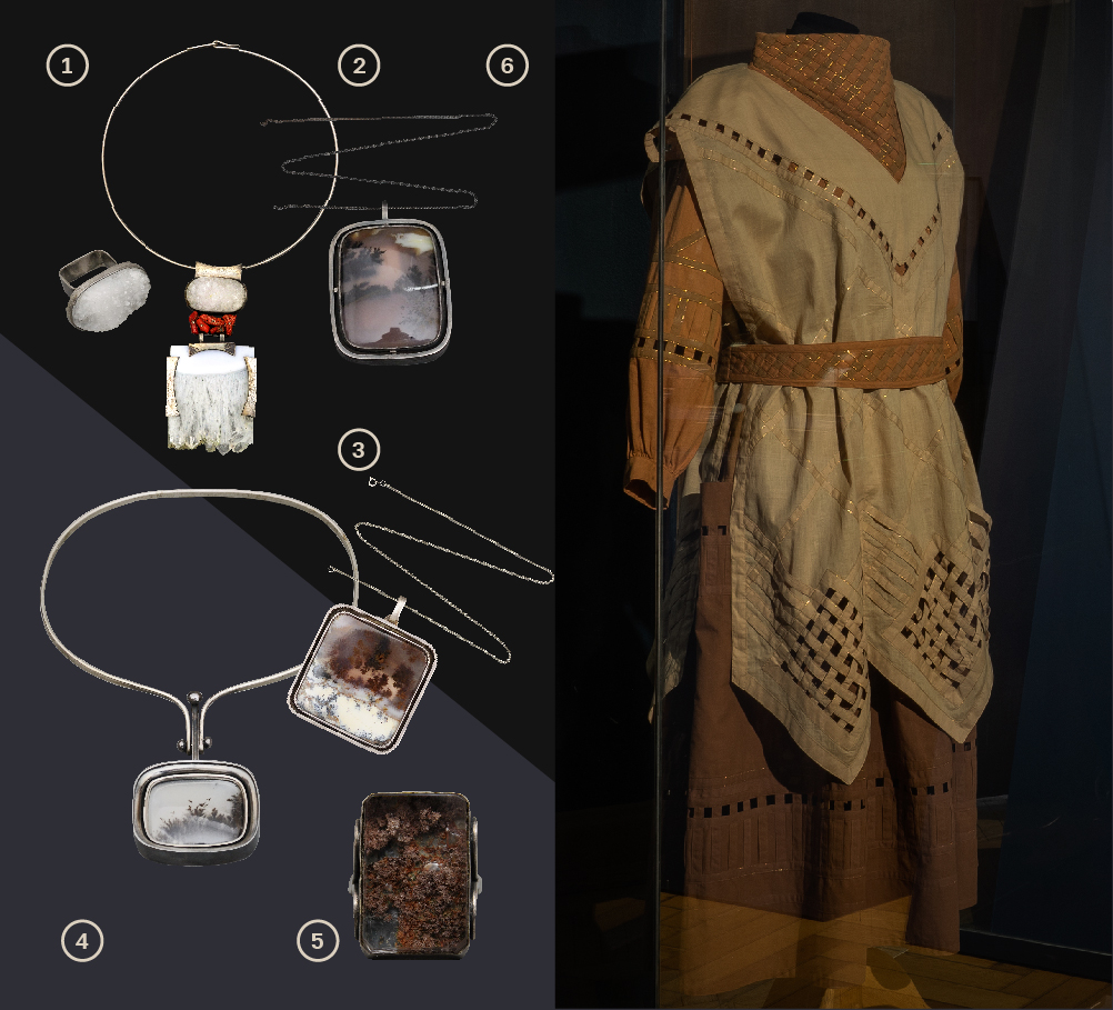 1. Парюр «Север» г. Ленинград 1970-е гг. Автор: В.Г. Поволоцкая Хрусталь горный, металл белый, коралл, серебро, монтировка Колье. Кольцо. Всероссийский музей декоративного искусства 2. Колье «Оттепель» г. Ленинград 1980 г. Автор: О. И. Оркин Агат, металл, серебро, монтировка Колье. Всероссийский музей декоративного искусства 3. Колье «Оттепель», г. Ленинград. 1980 г. Автор: О. И. Оркин Серебро, агат моховой (1 шт), металл, закрепка. Всероссийский музей декоративного искусства 4. . Кольцо «Тайга золотая» г. Москва 1970-е гг. Автор: Буданов Сергей Михайлович Кварц, серебро, монтировка, оксидирование, скань. Всероссийский музей декоративного искусства 5. «Летний полдень» ("Цветение"). Ленинград. 1980 г Автор: Оркин Олег Исаакович. Агат моховой, серебро, монтировка. Всероссийский музей декоративного искусства 6. Комплект одежды «Российские мотивы». СССР, г. Москва. 1986 г. Автор: Куприна В.И.. Всероссийский музей декоративного искусства