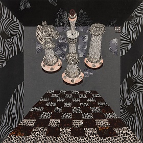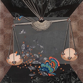 Людмила Успенская в 1967 году окончила Ленинградское высшее художественно-промышленное училище имени Мухиной. Ее специальность — художник по интерьеру. Однако довольно быстро ее ситцевые коллажи стали узнаваемым знаком времени и выдвинули Успенскую в ранг ведущих современных художников, работающих с оптикой и фактурой. Перед нами целостное высказывание о новом типе сознания: эклектичном, с «шахматами» по центру. Панно явно отсылает к рассказу «И грянул гром» Рэя Брэдбери, к пресловутому «эффекту бабочки», из-за гибели которой может начаться неконтролируемый поток событий, в итоге изменяющих мир. Неприметная легкая бабочка притаилась в самом низу, а над ней — чаши весов. Мы можем пропасть или спастись – в зависимости от того, на какую из них сядет это легчайшее существо. Завершающее панно нашей выставки глубоко передает тревожную и яркую суть эпохи «Нового Ренессанса» искусств в СССР, о которой мы говорили. Удастся ли нам упорхнуть в иной, альтернативный мир, или мы останемся привязаны к неизбывной тяжести и трагичности этого?