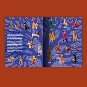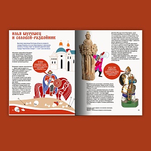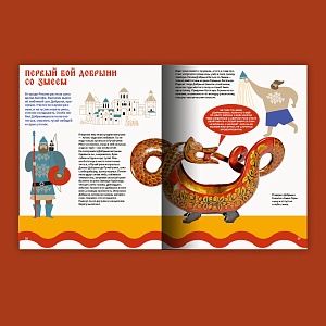 Чародей Вольга, Святогор-великан, Илья Муромец, Алёша Попович, Добрыня Никитич, Евпатий Коловрат, герои Ледового побоища и Куликовской битвы, - представлены на страницах книги с яркими авторскими иллюстрациями художницы Ольги Золотухиной. Героями книги стали и музейные экспонаты - гжельские и дымковский расписные богатыри, деревянные игрушки - солдатики-щелкуны, разводные полки, лаковые шкатулки с богатырскими сюжетами и др.