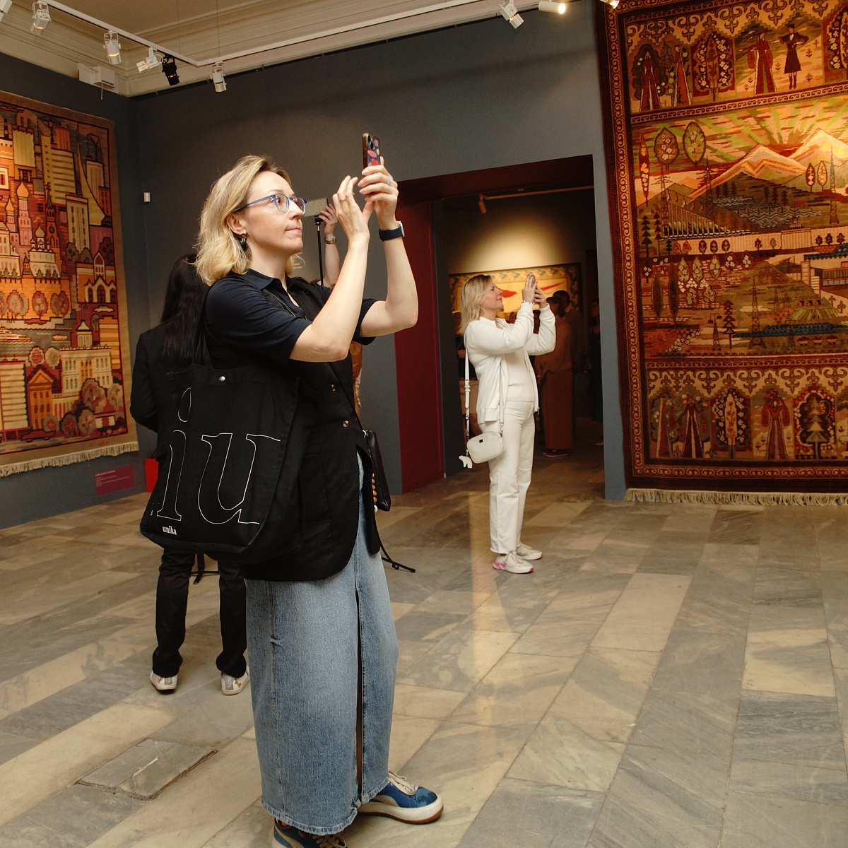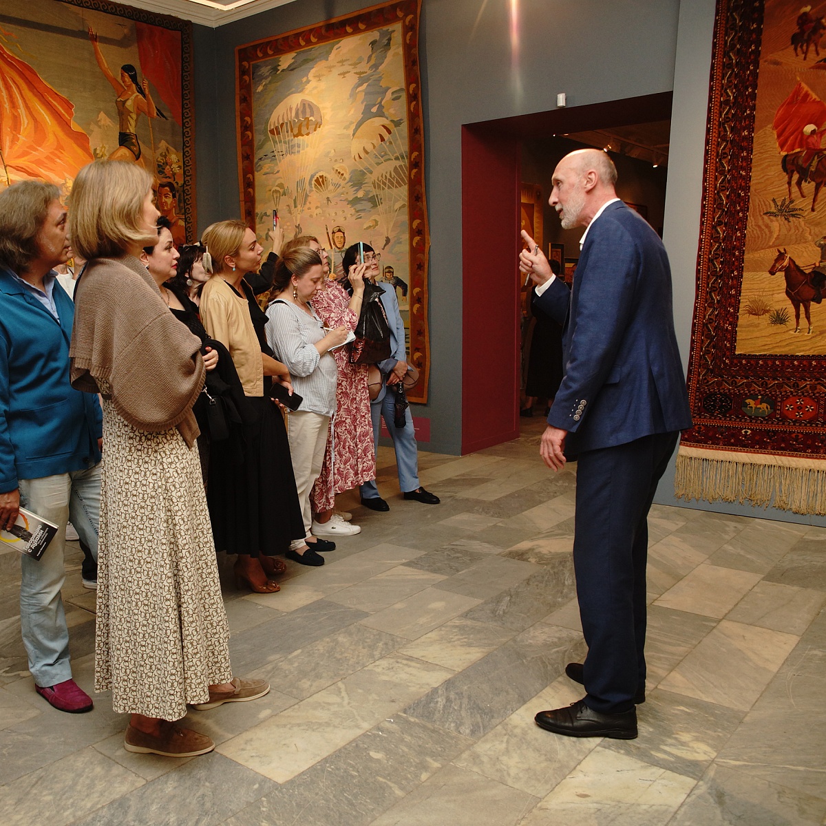 Торжественное открытие прошло в пространстве выставки, среди портретов знаменитых людей и огромного восьмиметрового ковра с гёлями. С приветственным словом к гостям мероприятия обратилась Елена Титова, директор Всероссийского музея декоративного искусства: «Мы рады представить вам масштабную и насыщенную выставку «Ковер историй. Сюжеты советского коврового искусств». Подготовка к ней шла несколько лет. Для выставочного проекта мы остановились на великолепных образцах нашего собрания – подарочных и парадных коврах. Многие из них принимали участие в международных выставках, представляя творчество лучших советских мастеров. Художники-профессионалы из института художественной промышленности придавали новый смысл традиционным народным мотивам, превращая ковры в отражение новых идеалов и счастливых историй. Наряду с редкими образцами здесь представлены и решения для массовой продукции, ставшей частью нового быта».
