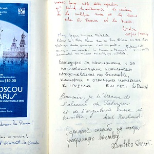 Специальными гостями церемонии стали заместитель Постоянного представителя Российской Федерации при ЮНЕСКО К.В. Рынза, дипломат Посольства Белоруссии во Франции У.А. Ярошевич, граф П.П. Шереметев с супругой, ценители «русского стиля» среди французской аудитории и соотечественников. Наш музей представили ученый секретарь музея, куратор выставки И. Б. Шалугина и руководитель, координатор проекта М. М. Смирнова.