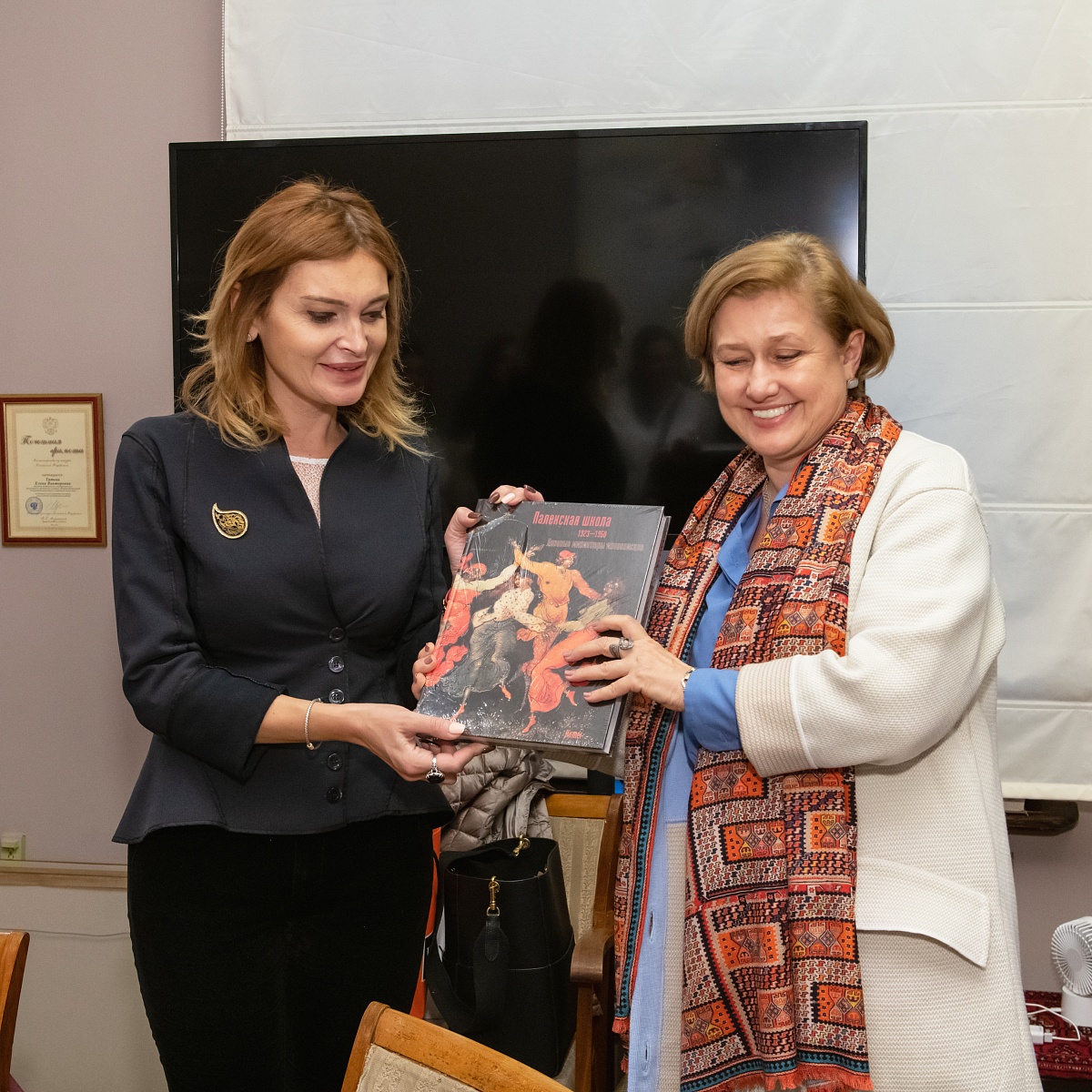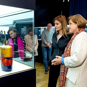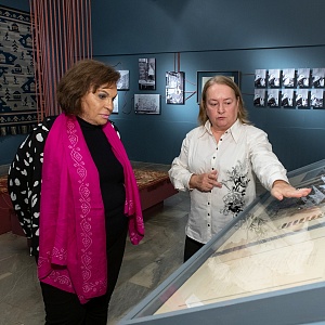 Директор Центра научной реставрации и консервации музейных ценностей и реликвий при Министерстве культуры Азербайджанской Республики Зарифа Меликова, директор Азербайджанского национального музея ковра Амина Меликова, специалисты по хранению, реставрации, образовательным программам познакомились с выставками «Ковёр историй. Сюжеты советского коврового искусства» и современной лаковой миниатюрой «Новые сказки».